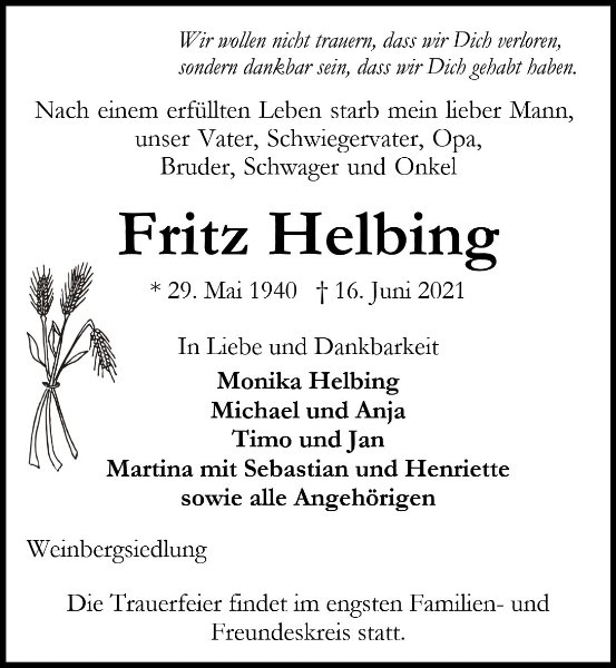 Jetzt sitzt ihr zusammen auf der Wolke. Grüß Mama und Papa.